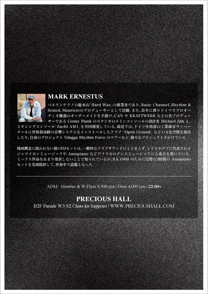 ベルリンテクノの総本山「HARD WAX」の創業者であり、Basic Channel、Rhythm & Sound、Maurizioのプロデューサーとして活躍。また、長年にわたりドイツでプロオーディオ機器のオーダーメイドを手掛け、CAN や KRAFTWERK などの名プロデューサーである Conny Plank のスタジオのメインコンソールの設計者 Michael Zah と、ミキシングコンソール「Zaehl AM1」を共同開発している。最近では、ドイツ中西部の工業都市ヴッパータールに世界最高峰の音響システムをインストールしたクラブ「Open Ground」などの文化空間を創出したり、自身のプロジェクト Ndagga Rhythm Force のツアーなど、様々なプロジェクトを手掛けている。既成概念に捉われない彼のDJセットは、一般的なクラブサウンドにとどまらず、レゲエやダブに代表されるジャマイカンミュージックや Amapiano などアフリカのダンスミュージックにも重点を置いている。ミックス作品をあまり発表しないことで知られているが、 RA.1000 のために完璧な2時間の Amapianoセットを先頃、提供して世界中で話題となった。